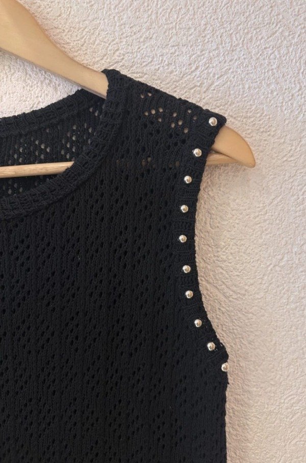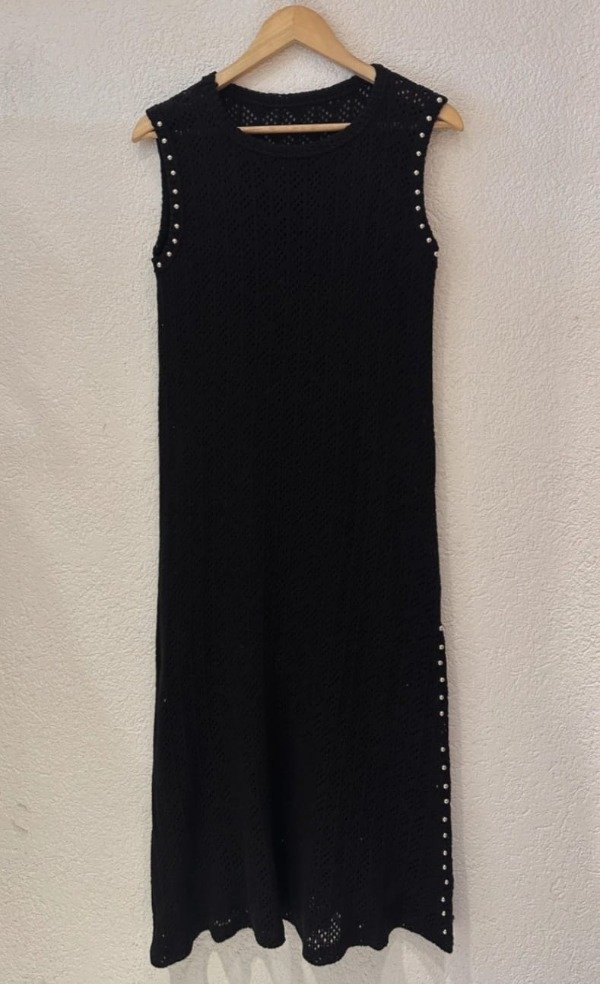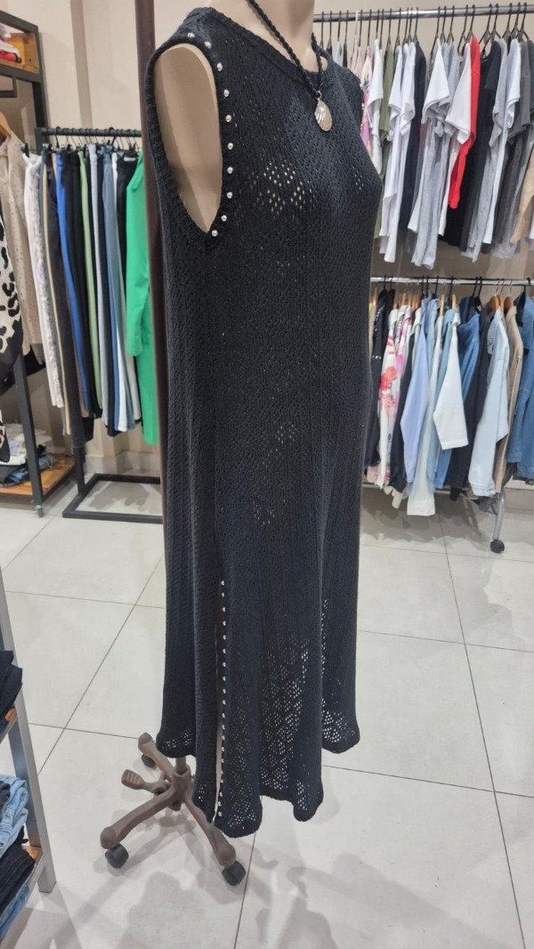 Vestido tejido con detalle de tachas en las sisas y en ambos tajos. Color Negro