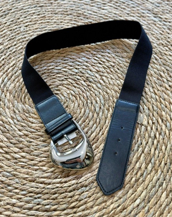 Cinturón elastizado Negro combinado con punteras rígidas y hebilla plateada. Largo 1.10cm