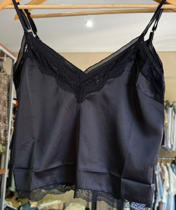 Remera de Saten Negra con tiras regulables y detalle de encaje en cuello.