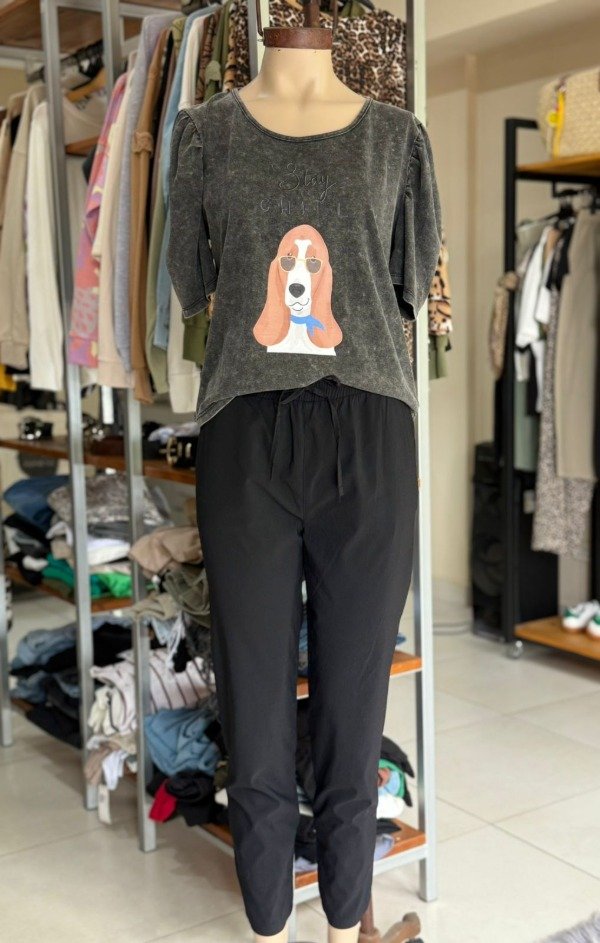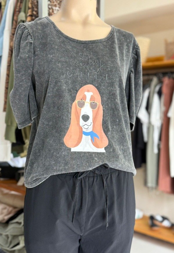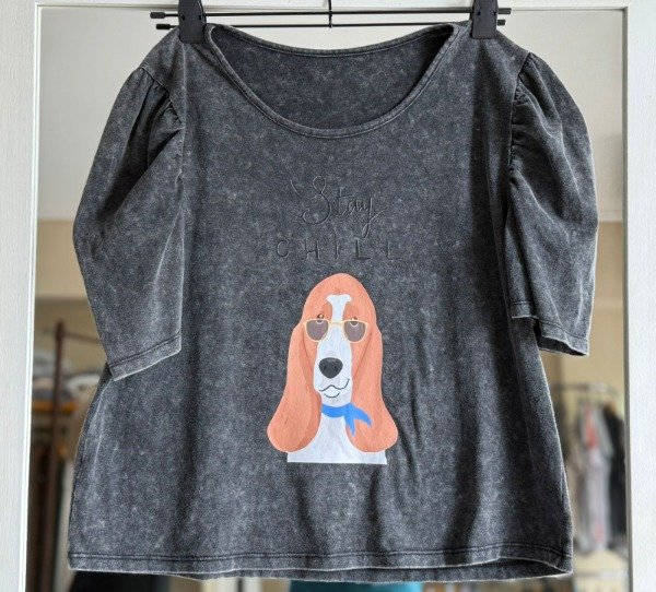 Remera de algodón gris prelavado con estampa y mangas princesa. Talle unico